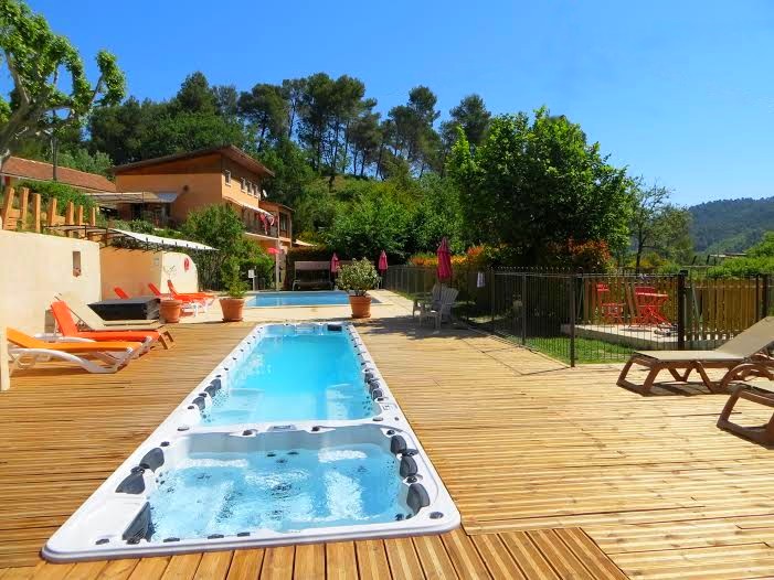 * piscine extérieure avec grand spa de nage en prolongation chauffé du 01/04 au 31/10